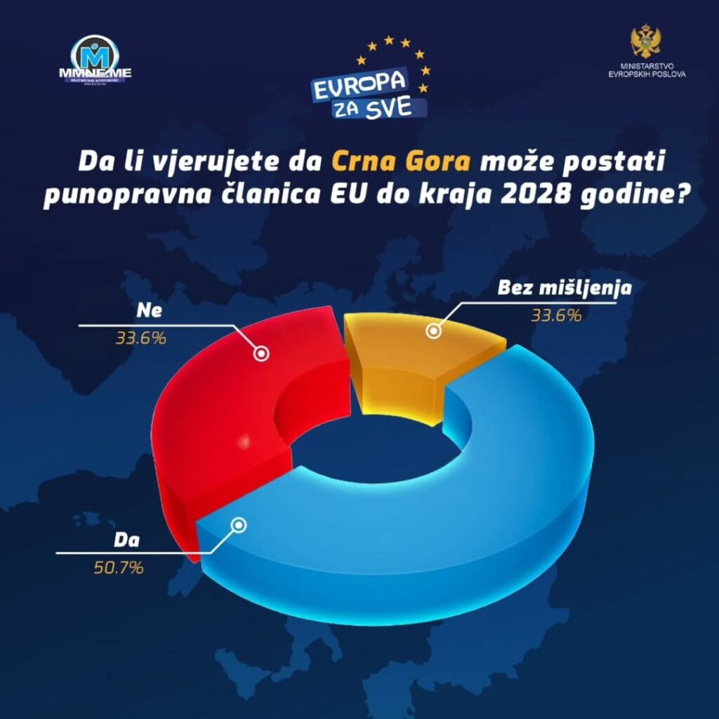 Polovina ispitanika (50,7%) smatra da Crna Gora ne može postati punopravna članica EU do 2028. godine, dok 33,6% vjeruje da je to realno ostvarivo.