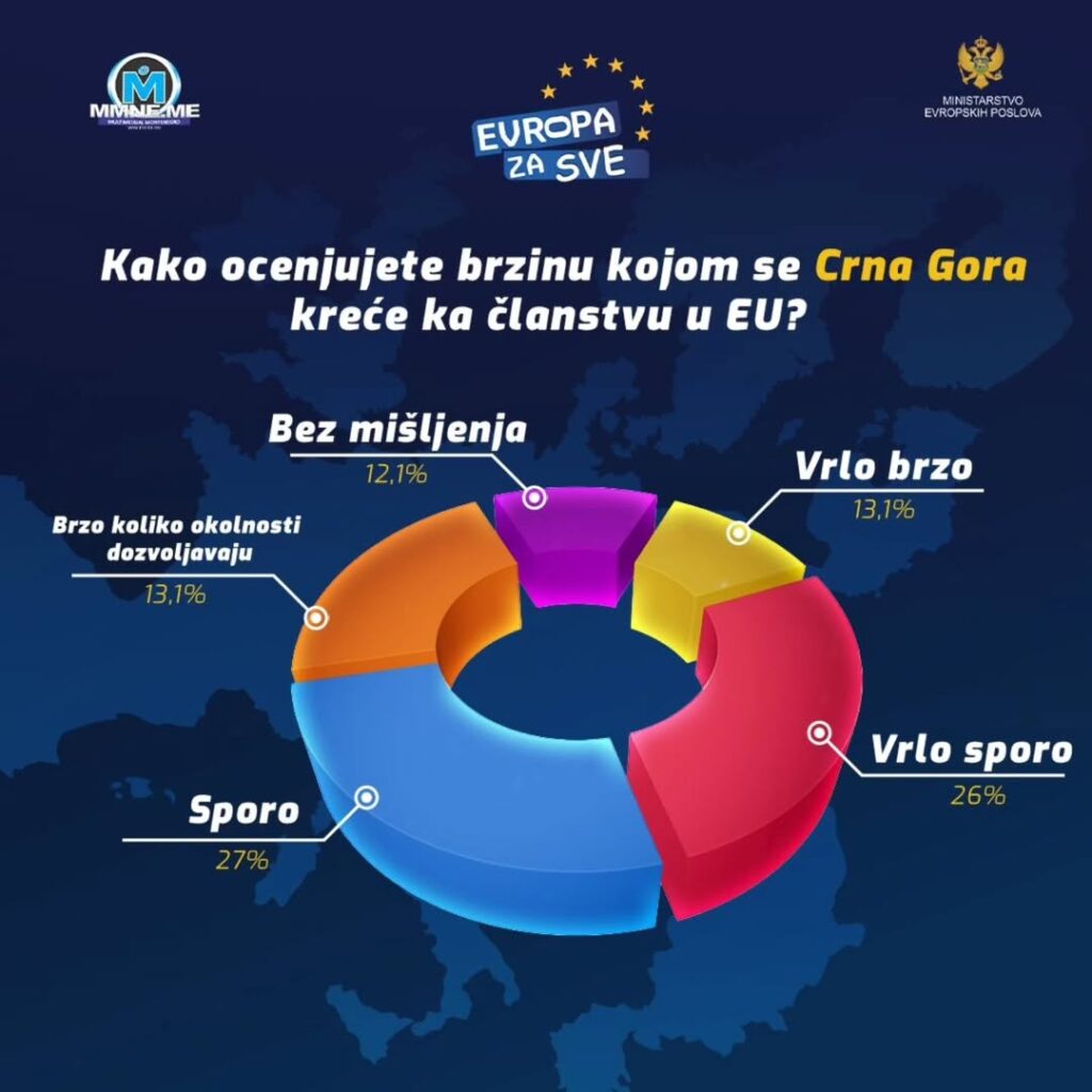 Kada je riječ o brzini procesa pristupanja, čak 53% ispitanika smatra da se Crna Gora sporo ili vrlo sporo kreće ka EU, dok svega 13,1% smatra da se napredak odvija „vrlo brzo“, a 21,7% „brzo koliko okolnosti dozvoljavaju“.